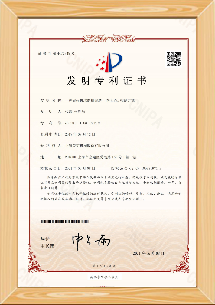 • 一種破碎機球磨機破磨一體化PMB控制方法專利證書