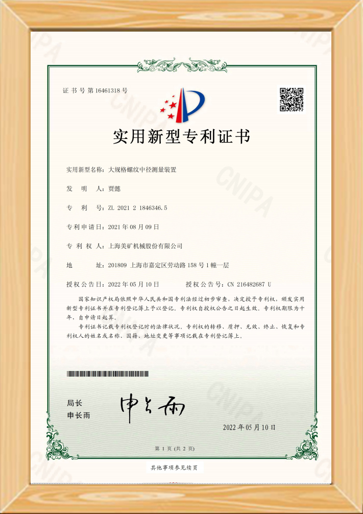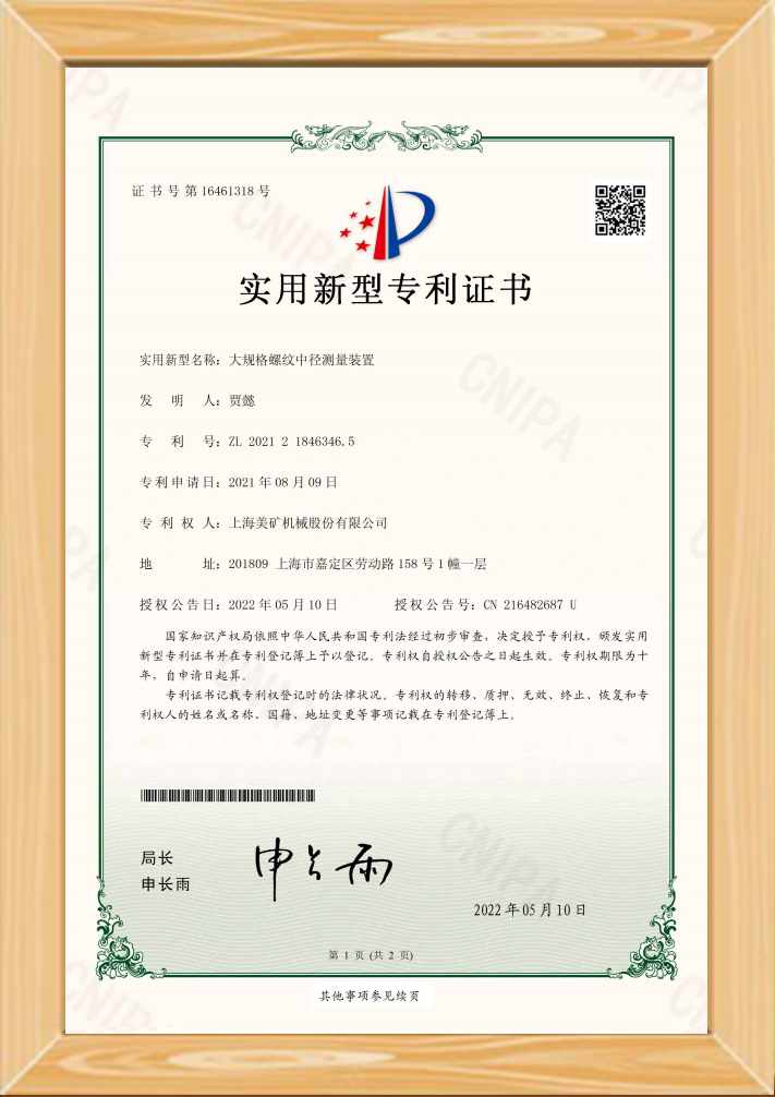 • 大規格螺紋中徑測量裝置實用新型證書