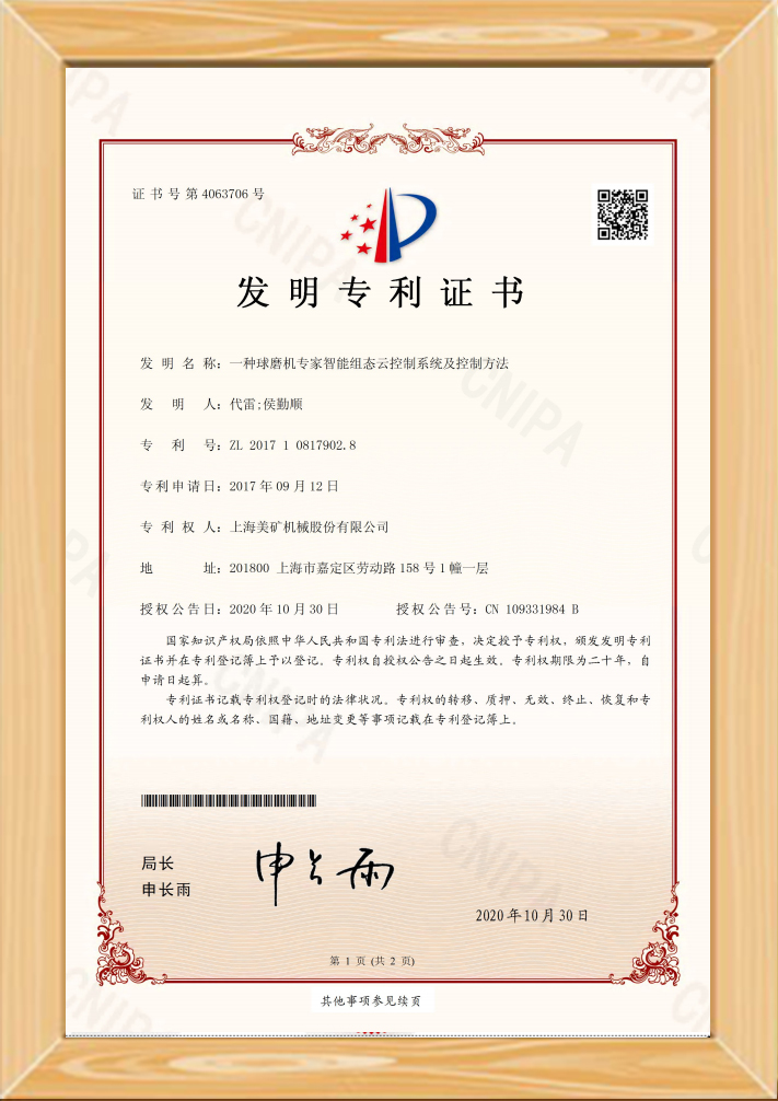 • 一種球磨機專家智能組態系統及控制方法發明專利證書