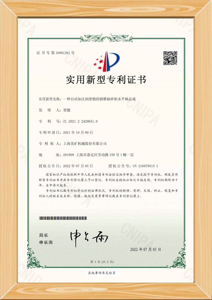 • 一種自動加注潤滑脂的圓錐破碎機水平軸總成專利證書